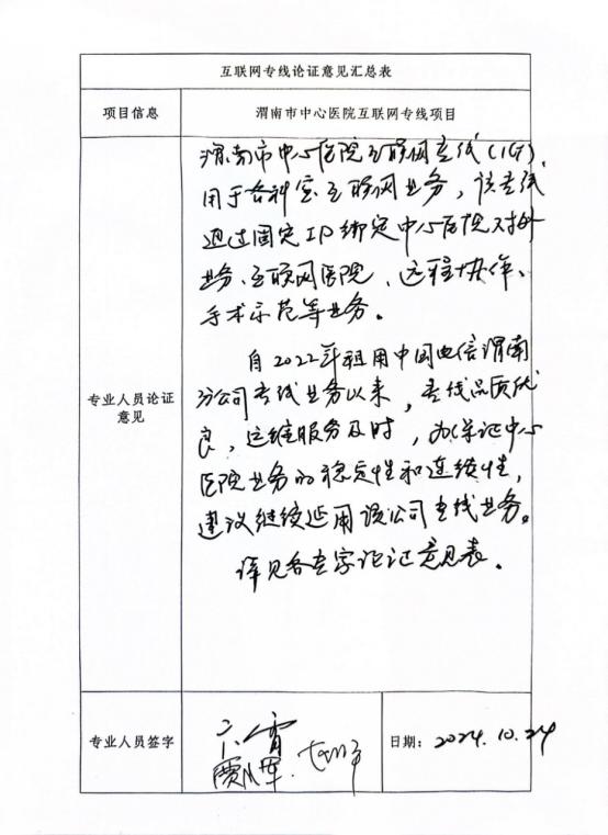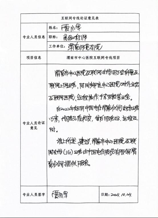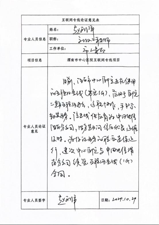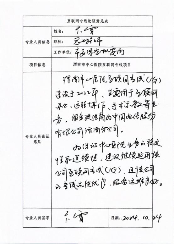 本院互联网专线(1G)项目供应商为中国电信股份有限公司渭南分公司,目前专线用于医院二期互联网办公、远程协作、手术示教等业务,有固定的IP地址,已绑定医院相关业务,渭南电信服务期间售后优良、运维及时,综合考虑不宜频繁更换线路。