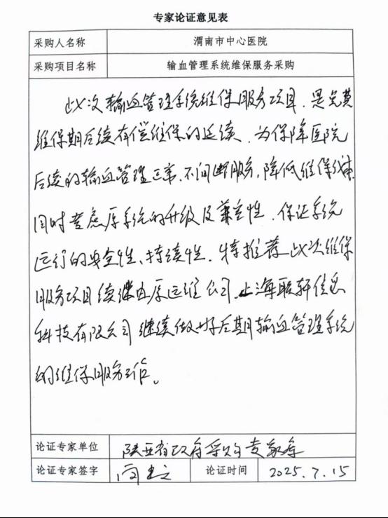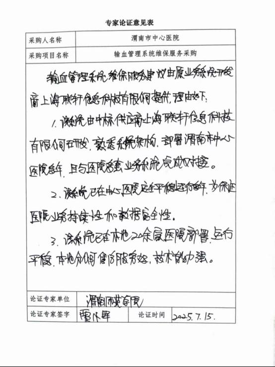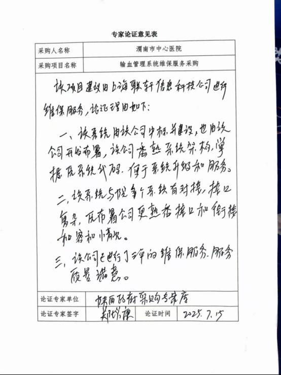 五、申请理由:上海联轩信息科技有限公司是医院输血管理系统的开发公司,熟悉系统架构和代码,便于系统升级和维护。