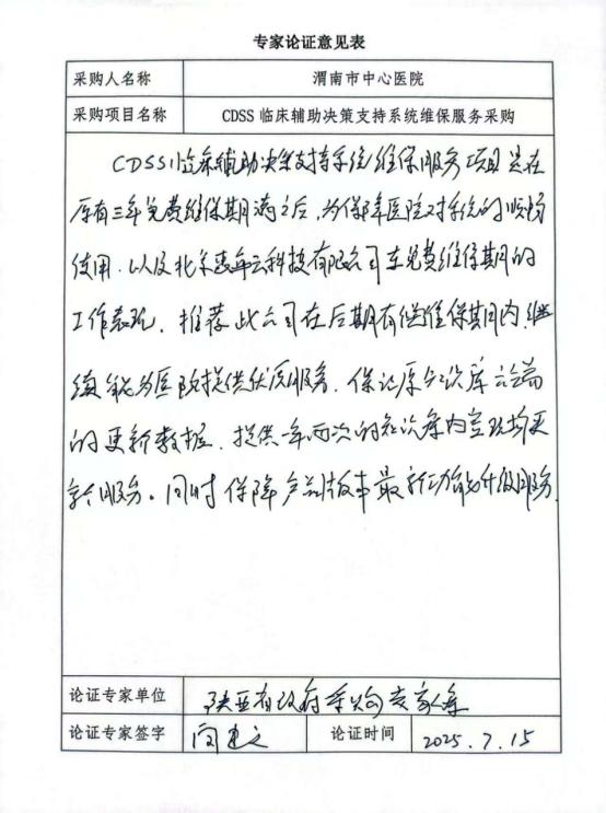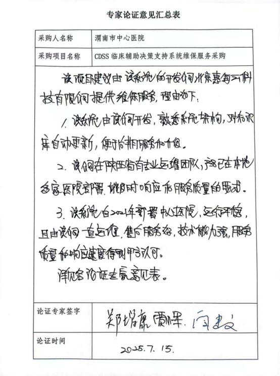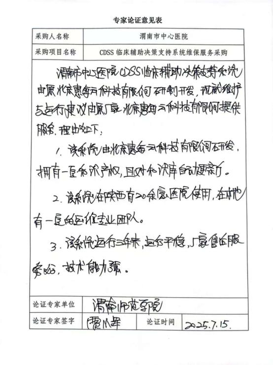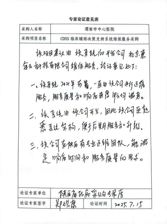五、申请理由:北京惠每云科技有限公司是医院CDSS临床辅助决策支持系统的开发与实施公司,熟悉系统架构,自2021年医院部署该系统以来,定期对知识库进行自动更新,售后服务好,建议由北京惠每云科技有限公司继续做好后期维保服务工作。