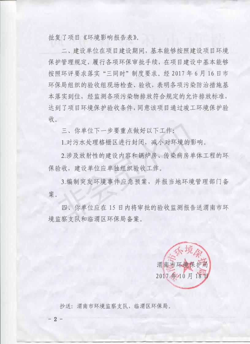 因医院规模逐渐扩大,污水量增加,二期污水处理设施正在筹备建设中。