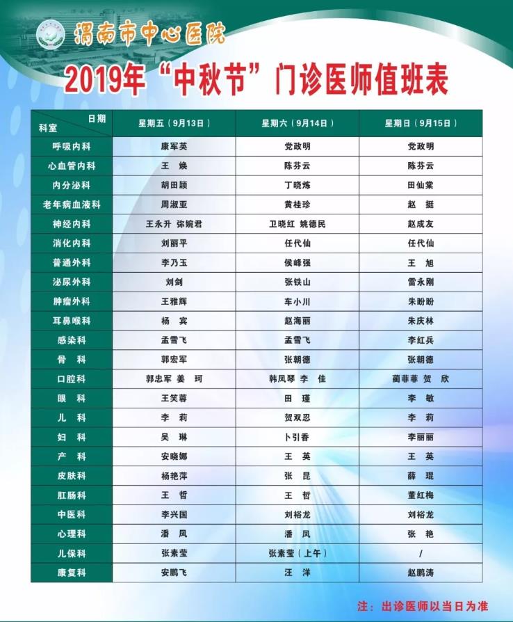 按照国家法定节假日安排并结合我院实际情况,现将2019年 “中秋节”期间门诊安排通知如下: