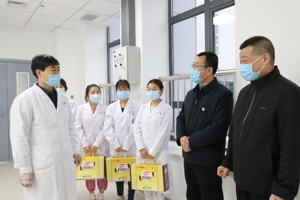 院领导分组给防疫一线的医护人员们送上牛奶、面包和泡面等食品。在核酸采集处、预检分诊、发热门诊、核酸检测实验室、感染性疾病科等处,院领导叮嘱医护人员们一定要做好个人防护,同时注意休息。