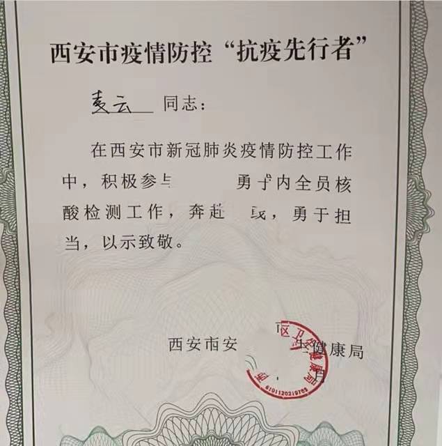 科室护理队伍中曾经的战友胡凌云,因为家庭原因离开了这支队伍,但是她毅然在这次没有硝烟的战争中挺身而出,加入了志愿者团队。她说:“封城后的第一天,西安下起了大雪,那天核酸采集结束已经凌晨了,手早已被冻得没有知觉不能弯曲,一次次地消手,酒精的挥发又把手上的所有热量轻松带走,非常的冷”。我问她:“作为一名城市志愿者累了是可以随时走,你怎么不走。”她说:“我曾经是护士,这个时候怎么能走,在城市需要伸出援手的时候就要坚持到底,人人护城,城必胜!”