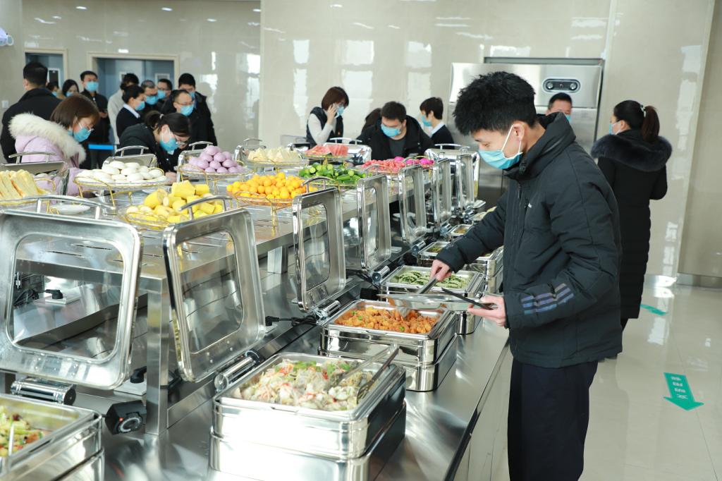 职工餐厅楼共两层层,分别为档口出品、自助餐区,内部装饰一新,整洁明亮、设施齐全、环境优雅舒适。在食谱安排上,菜品丰富多样,营养搭配,可自由选择。就餐职工的长队一直排到了餐厅入口处,座无虚席,热闹非凡,每个职工脸上都洋溢着满满的幸福感。