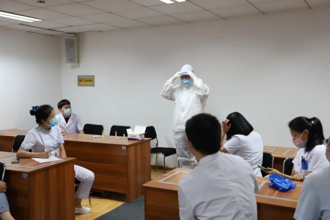 8月19日,科教科联合护理部为19名志愿者进行核酸采样相关业务培训,培训内容包括穿脱防护服、鼻咽拭子采集等。培训考核结束后,住培医师们即将投身社区开展核酸采样工作。