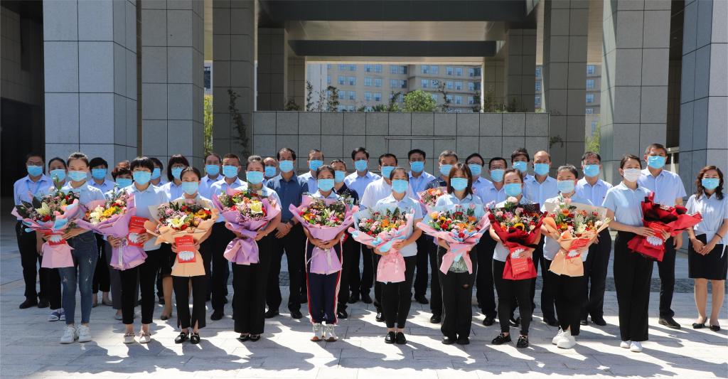 9月6日,乐鱼手机站入口举行仪式欢迎12名省外核酸采样队员平安凯旋,医院领导班子成员、全体队员、相关科室负责人参加。