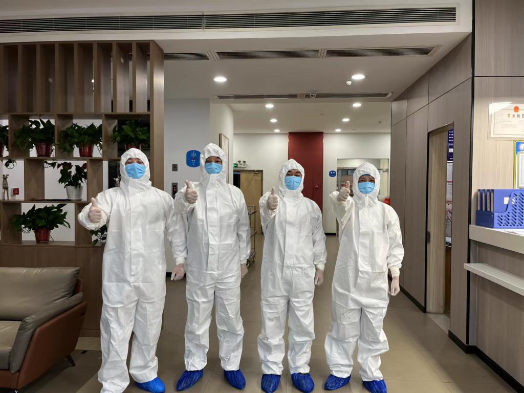 按照闭环酒店感染控制要求,党政办曹胜利、外联办罗渭峰、科研教学科何博武、内镜中心崔盾24小时轮流值班,依据工作流程配制消毒液,规范穿脱防护服,肩背30斤重的消杀桶,从酒店一楼大厅至4楼对办公区地面、酒店走廊、电梯间、医废处置间等每日三次进行全面消杀。严格执行闭环酒店医疗废物交接及登记制度,指定专人负责医疗废物存放区管理工作。每天早晨核酸采样完毕时,当班2名工作人员规范穿着防护服对医疗废物进行规范包扎、准确计重及注明标签等,与医疗废物处置公司双方现场办理交接手续,完毕后对医疗废物存放区、过道及交接区进行全面消杀,累计完成交接医疗废物约2900千克。经常在消杀及医疗废物处理结束时,大家防护服内衣服已经被汗水浸透。