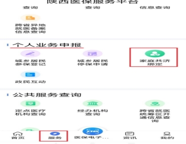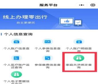 1、点击【服务】—【个人业务查询】—【家庭共济绑定查询】。