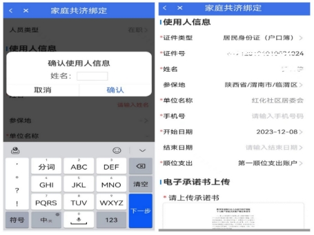 4、进入家庭共济绑定信息填写页面,根据提示填写“使用人”的个人信息,确认无误后,点击【查看个人承诺书并完成签名】。