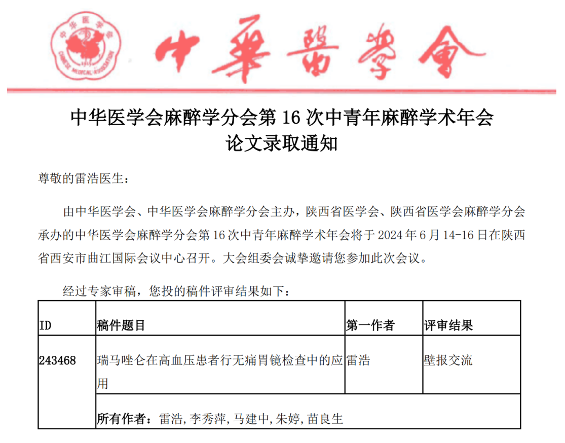 近日,乐鱼手机站入口麻醉手术科与消化内科联合撰写的论文《瑞马唑仑在高血压患者行无痛胃镜检查中的应用》成功入选中华医学会麻醉学分会第16次中青年麻醉学术年会,并获得壁报交流机会。
