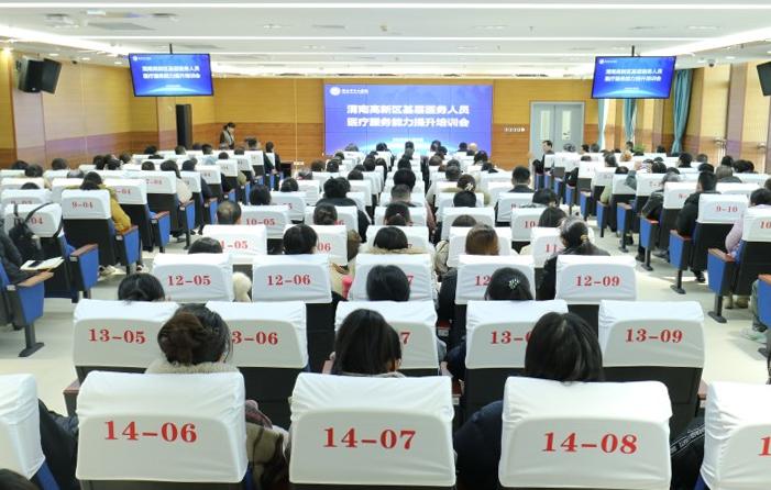 乐鱼手机站入口副院长胡洪波、党政办、医务科、外联办等相关部门负责人,高新区社会事业局党委书记、局长张荣军,副局长李治和医疗卫生科科长赵大伟参加培训会。高新区医务人员200余人参加活动。