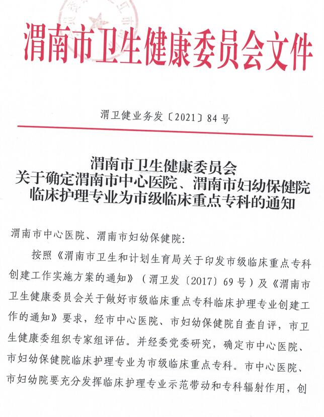 近日,渭南市卫生健康委公布市级临床重点专科名单,市中心医院临床护理专业被确定为市级临床重点专科,开创了我市临床护理专业获评市级临床重点专科的先河,是医院重点专科建设的又一个里程碑。