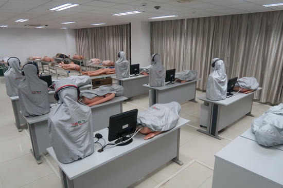 基地现拥有教学场地面积3900㎡,投入专项资金500余万元,购置国内外先进的临床模拟教学仪器和培训设备,是目前全省投资较大、设备较先进、基本临床培训科目较齐全的全科医师规范化培训基地。设有全科医师临床技能训练中心,拥有高级生命支持模拟人,临床诊断思维教学系统,临床心电图诊断及考核系统,基本穿刺模拟训练人,心肺听诊与腹部触诊仿真教学系统,新生儿和儿童模拟静脉穿刺、输液、气管插管等模拟人,无菌操作、体表肿物切除、关节穿刺、切开缝合、骨折固定训练等外科模拟设施,孕妇腹部触诊、刮宫、分娩示教等妇产科模拟设施,新生儿、儿童及成人心肺复苏模拟训练(CPR)、气管插管、电除颤等急救模拟设施,视网膜病变检查、耳内检查、鼻腔出血检查等模型,全科基本生理检查、眼耳检查壁挂诊断系统等。另外基地临床技能训练中心还配置了进口呼吸机、进口电子支气管镜等医疗器械。