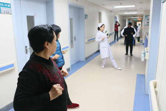 “乳腺术后有氧运动康复操”是将全身运动与局部肢体相互结合的运动。每天早晨8点,在音乐旋律的配合下,由专科护士现场集中指导训练,这样能够提高患者坚持康复治疗的主动性和顺从性,使患肢关节活动度和肌力达到最佳恢复状态,从而缩短患肢恢复时间,提高病人生活质量。