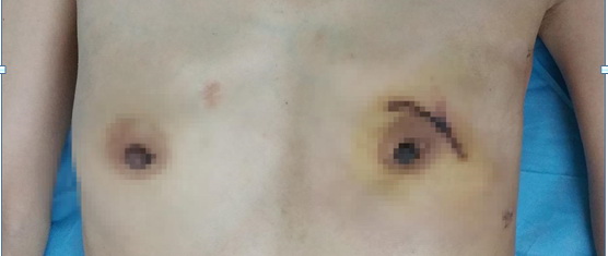 肿瘤外科收住一名47岁女性因体检发现乳腺包块确诊为乳腺癌患者,患者是位注重外形美观、热爱生活,要求在保证治疗效果前提下尽量保持乳房外形,结合患者乳房外形、经济能力及个人意愿,科室讨论后制定行保留乳头乳晕复合体乳腺癌改良根治术。在王勇主任医师指导下由卜智斌主治医师完成手术,术后恢复顺利,患者及家属对治疗效果非常满意,是我市首例保留乳头乳晕复合体乳腺癌改良根治术,填补我市该邻域空白。
