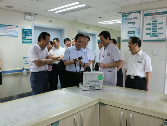 当李市长一行来到我市重点学科——心血管内科时,护士站的远程心电监护系统引起了李明远市长极大的兴趣,作为通信与信息系统方面的专家,他很好奇地向心内科主任李军农了解这个系统。李主任介绍到:远程心电监护系统可以远程实时了解患者的心率、呼吸、脉搏、血压和血氧饱和度的各项监测数据,更能对患者实时的基本生命体征、心电状况进行监测,提早预防恶性心律失常及猝死的发生,我们的这个系统就曾经救治过数名病人。