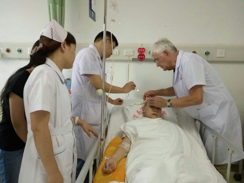 随后,彼得教授来到神经外科医生办公室。他不仅是一家医院的院长,更是一名神经外科的教授,他掌握了该领域广泛的先进理论知识,并且具有丰富的临床诊断和手术经验,所以他很期待同我们的神经外科医生进行交流。在经过短暂的自我介绍后,彼得教授跟神经外科的医生们对几个典型病例和疑难病例进行分析讨论。之后彼得教授针对儿童颅骨修复、胶质瘤术后水肿的用药、开颅大骨瓣减压手术等,都给予了可行有效的治疗方法及指导意见。在这两天时间里,彼得教授不仅走进病房进行大查房,对患者的病情详细询问并给予治疗意见。还跟神经外科的医生们一起进手术室,进行术前指导,并把先进的治疗理念分享给我们的年轻医生们。