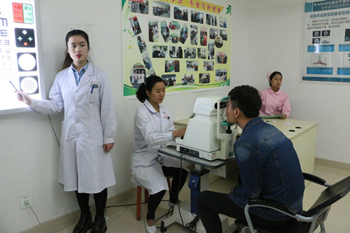 为了有效预防糖尿病致盲,我院眼科在门诊举办义诊活动,为市民进行预防糖尿病致盲的健康知识讲座。同西龙主任为市民答疑解惑、提供眼科保健咨询。成瞒曼护士长和眼科医护人员还为市民免费测视力和眼底检查。对于糖尿病患者,提醒其要定期来医院做眼部检查,对病变及早发现、及早治疗。
