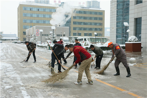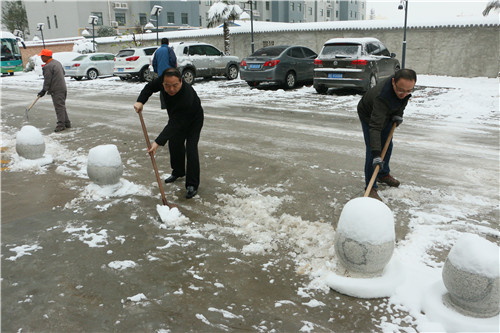 院领导身先士卒,掀铲扫雪,职能科室的工作人员有的用扫帚、有的用铁掀。大家同心协力,先铲起坚硬的雪块,把雪块拢成一堆,再用扫帚扫净残留在路面的冰屑,铲、推、扫,场面热火朝天。经过两个多小时的奋战,在大家团结协作下,院区车道上的积雪打扫得干干净净。