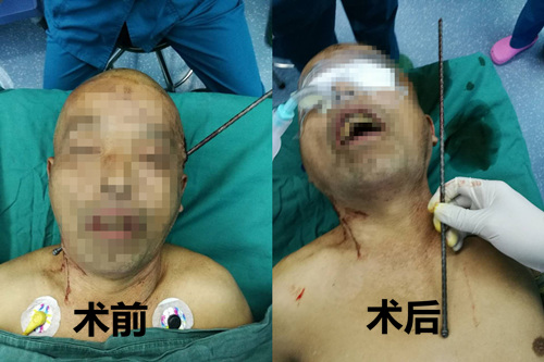 据急诊科副主任贾再利介绍,患者是一名工人,受伤时正在工地施工,一根金属异物从左侧的颧骨上穿透到右侧颌下,属于贯通伤。