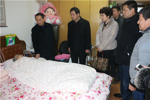 一位老职工常年瘫痪在床,院领导到老人床边看望老人,张院长和鲁书记特别嘱咐老人的儿子要悉心照顾老人,并强调有什么困难找医院,医院会尽最大力帮助大家。