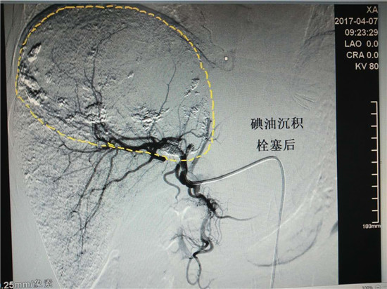 4月7日上午8时30分,介入科团队合作顺利完成一例巨大血管瘤介入栓塞治疗。