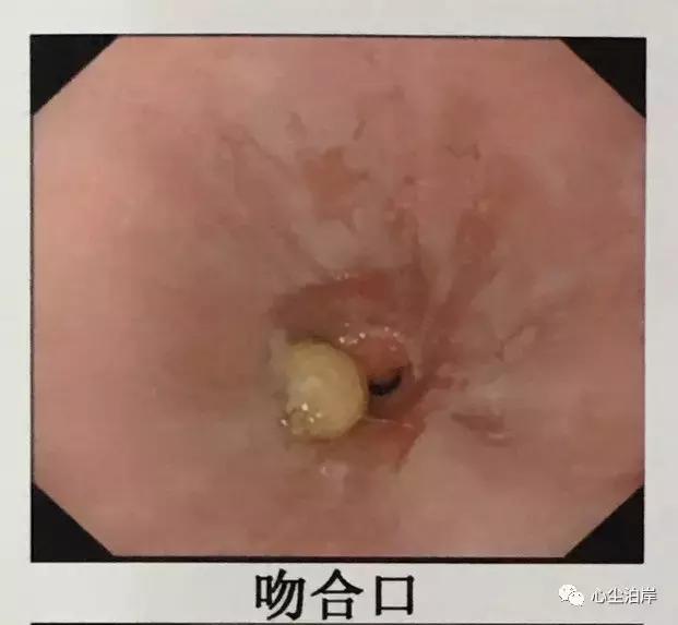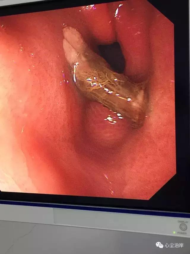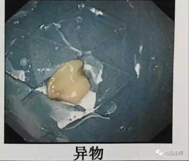 胃镜下见食管通畅,吻合口黏膜光整,腔稍狭窄,进镜虽略有阻力,但尚可通过,只是食管腔内半粒花生仁清晰可见,并随着食管蠕动,不时梗住吻合口却无法通过。