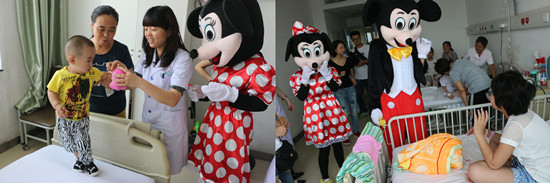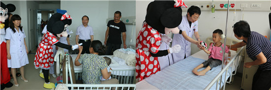 “小朋友们,节日快乐!”在儿科病房,张进社院长和贺双忍主任为住院的孩子们送上节日的祝福和礼物。精美小扇子、毛绒玩具......儿科的医护人员装扮成迪士尼卡通人物,给每个病房的孩子们都发了节日礼物,孩子们高兴地和医护人员们合影。