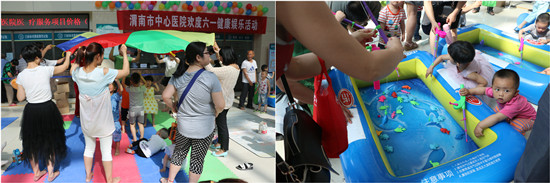 义诊现场,“欢度六•一 健康娱乐”活动也在如火如荼进行着。家长和孩子们一起配合玩降落伞游戏,孩子们在彩色降落伞下观察到的天空是五颜六色的。还有部分孩子参加钓鱼比赛,家长们都在激动地为孩子加油鼓劲。活动结束后,医护人员为孩子们送上精美的小礼物。