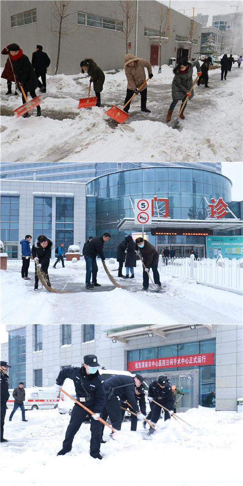 2018年的第一场雪在大家的期盼中飘然而至,使整个城市银装素裹。兴奋之余,厚厚的积雪和结冰的路面也给人们的出行带来了诸多不便。为保障患者就医安全,1月4日一大早,院领导带着行政、后勤的同志们在医院进行扫雪开路。