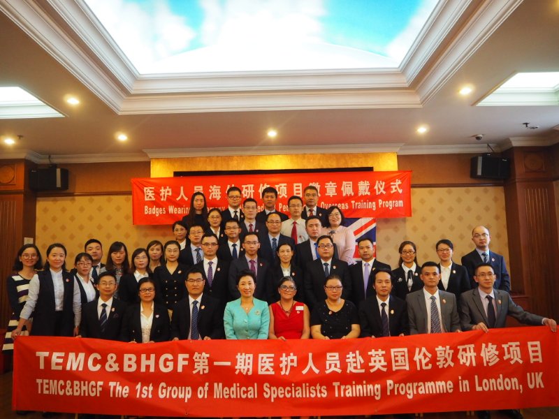 图1:行前会上TEMC&BHGF陈冉主任、英国驻华大使馆医疗卫生及生命科学行业主管Ray Smith女士与全体赴英医护人员合影留念