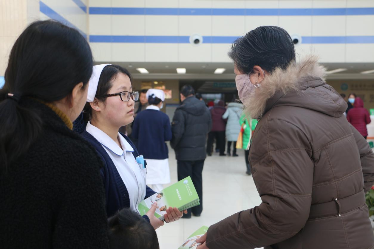 活动当天,来自我院肿瘤内科、肿瘤外科的专家和优秀的护理工作者不畏严寒,一大早就准备好宣传资料、桌椅板凳坐在大厅等待。