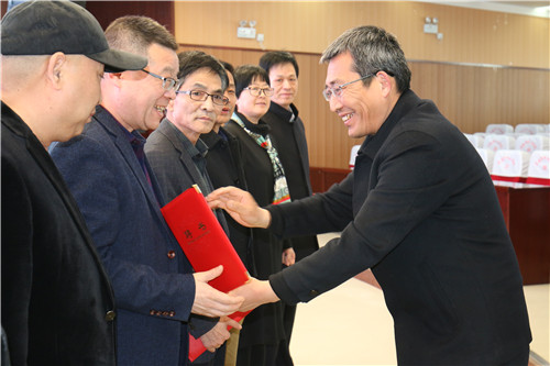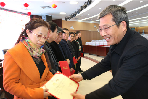 渭南职业技术学院医学院赵新平院长为我院10名兼职受聘教师代表颁发聘任证书。赵新平院长和教师代表一一握手并合影留念。