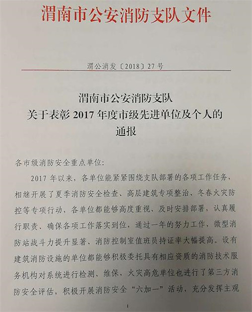 为表彰先进,树立典型,进一步提高全市重点单位的消防安全管理水平,增强全市重点单位的消防安全意识和自防自救能力,全力夯实良好的社会消防工作基础。渭南市公安消防支队日前表彰了一批消防安全先进单位及个人,我院被授予“2017年消防先进单位”荣誉,保卫科科长朱永强荣获“先进个人”称号。