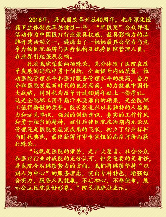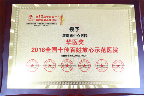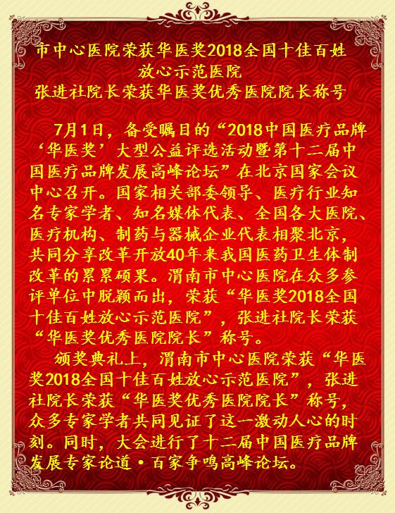 重磅 市中心医院荣获华医奖2018全国十佳百姓放心示范医院