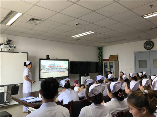 科护士长解明侠以“做一个有温度的护士”为主题的医学人文知识授课。在解老师授课时,开展“不忘初心,牢记使命”的主题教育,组织大家重温“南丁格尔”誓词,从当代名医的角度解读了医学人文知识的丰富内涵,并从理论和实践两方面培训了医学人文关怀的具体内容,包括良好的人文素养,对于从事护理工作的护士形成严谨求实、遵守纪律和技术过硬的工作作风起到重要促进作用。