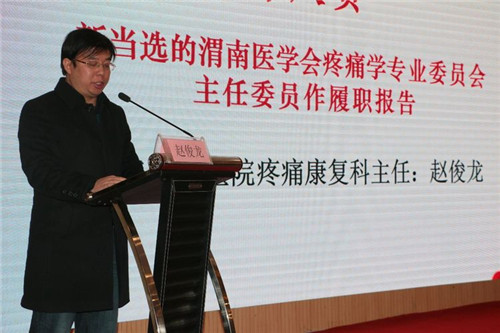 新当选的赵俊龙主委作了履职报告。他表示,在今后的工作中将做好本职工作,加强与上级单位的学术交流,加大疼痛人才的培养力度,为年轻医师提供一个广阔的疼痛专业学习交流的平台,为全市人民的健康生活而努力奋斗。