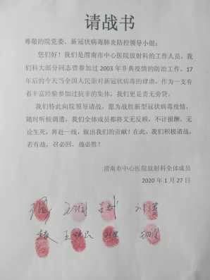 面对疫情,战斗坚守在一线是他们的呼声,百余名医护工作者写下“请战书”申请赴前线,通过微信和短信表达上一线的更是难以计数,他们自发性捐款,购买防护用品,希望能够送达前线,尽一份微薄之力。