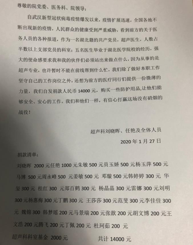 疫情牵动着每一位超声人的心。超声科医务人员第一时间伸出援助之手,争当爱心排头兵,刘晓辉主任带头捐款。今年,超声科被评为医院先进科室,并获得新业务新技术奖,大家一致同意将奖励金捐献出来,共捐款14000元,希望为新型冠状病毒肺炎疫情的防控工作出一份力。危急时刻,不论是勇往一线还是坚守后方,他们的善举汇成一股股暖流,在寒冬温暖了整个医院,整座城。