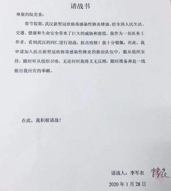 在抗击新型冠状病毒肺炎疫情形势严峻之际,乐鱼手机站入口干部职工主动请战,郑重签下姓名,纷纷表示时刻听从召唤,愿意随时奔赴防控新型冠状病毒肺炎疫情第一线。一封封请战书饱含了乐鱼手机站入口全体职工抗击疫情的忠诚、执着、决心和信心。请战书中有共产党员,有普通职工;有来自临床一线,也有来自职能科室;有学科带头人,也有入职不久的职工……