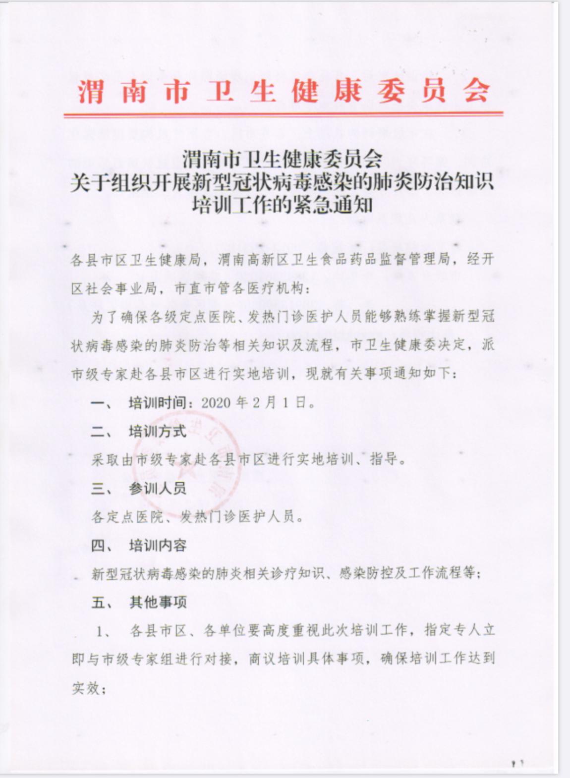 2月1日中午,乐鱼手机站入口接到渭南市卫健委关于选派市级专家赴各县对全市各级定点、发热门诊医护人员能够熟练掌握新型冠状病毒感染的肺炎防治等相关知识进行实地培训的紧急通知,乐鱼手机站入口收到通知后,医院防控工作领导小组迅速安排人员,排除一切困难,协调人员,抽调下夜班的重症医学科李冬纯主任医师、李媛媛主治医师,呼吸内科康军英副主任医师及感染性疾病科孟雪飞副主任医师四位专家在保证医疗安全的前提下奔赴全市各个区县进行培训。