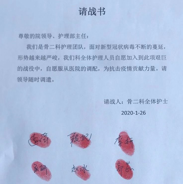 1月27日14:30,作为护理应急队员,她参加了医院新型冠状病毒感染知识培训。培训结束后,得知疫情严峻,她义无反顾签下了请战书。“疫情严峻,我虽然也有害怕,但是作为一名护士我没有理由退缩,作为应急队员,抗击疫情,更是责无旁贷。”她说道。