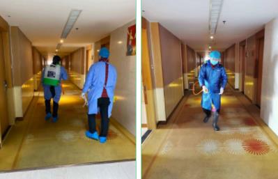 每天对留观人员、临时休息人员身体健康情况的监测和记录,若发现异常及时向医务科报告。每日二次定时对房间和公共区域(走廊、电梯间等)消毒、开窗通风,做好消毒防控工作。