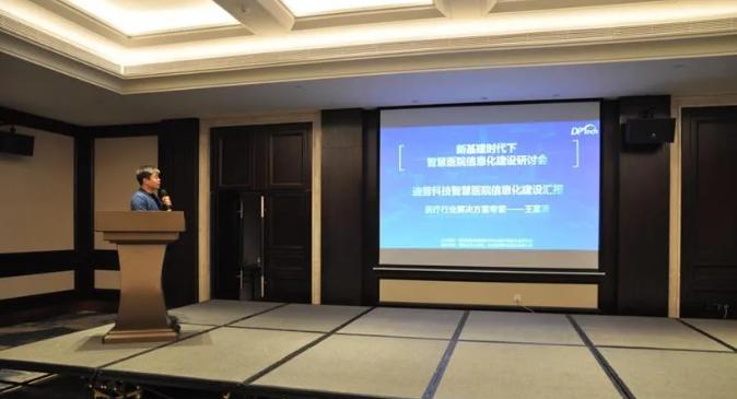 杭州迪普科技医疗行业解决方案专家王富涛为大家带来了智慧医院信息化建设汇报,向参会单位汇报了迪普科技在智慧医院的建设中的经验分享,针对医院新基建中的特色解决方案自安全园区网进行了介绍。对迪普医院行业的成功案例进行了分享。