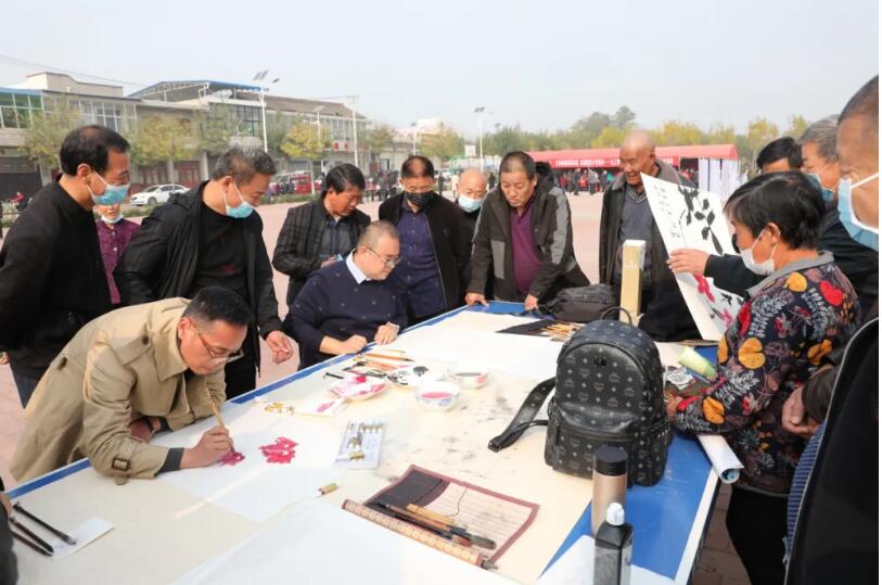 在书画服务区,书画家现场挥毫泼墨,创作了40多幅贴近乡村、寓意美好的书画作品,希望通过送高雅文化艺术到乡村,促进乡村文化建设,提高群众文化修养,为拔出“穷根儿”、推动张桥镇的精准扶贫工作作出贡献。