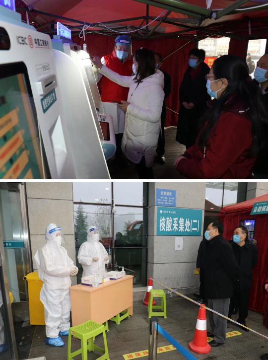 随后督导组一行来到急诊入口南侧的自助核酸检测开单及报告打印机处,对医院核酸采集和检测结果查询流程工作表示认可。此项便民措施的实施,不仅节省了市民时间,而且降低了交叉感染风险。督查组对核酸采集处的医务人员个人防护、重点人员核酸检测、发热病人的处置流程等内容进行了随机询问。