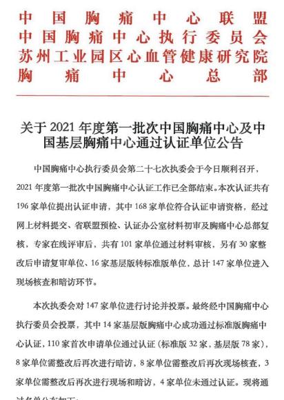 5月17日,中国胸痛中心总部发布《关于2021年度第一批次中国胸痛中心及中国基层胸痛中心通过认证单位公告》,乐鱼手机站入口位列其中。标志着医院顺利通过中国胸痛中心认证成为国家级标准版胸痛中心。