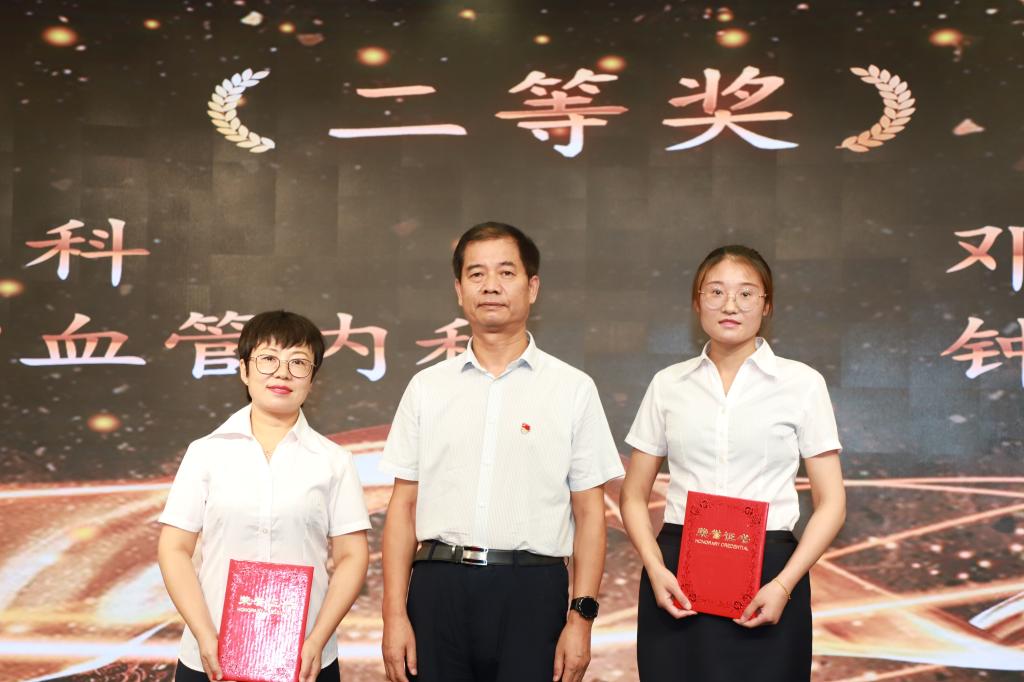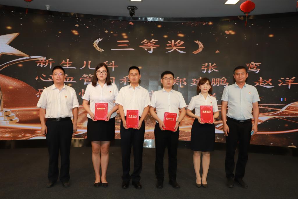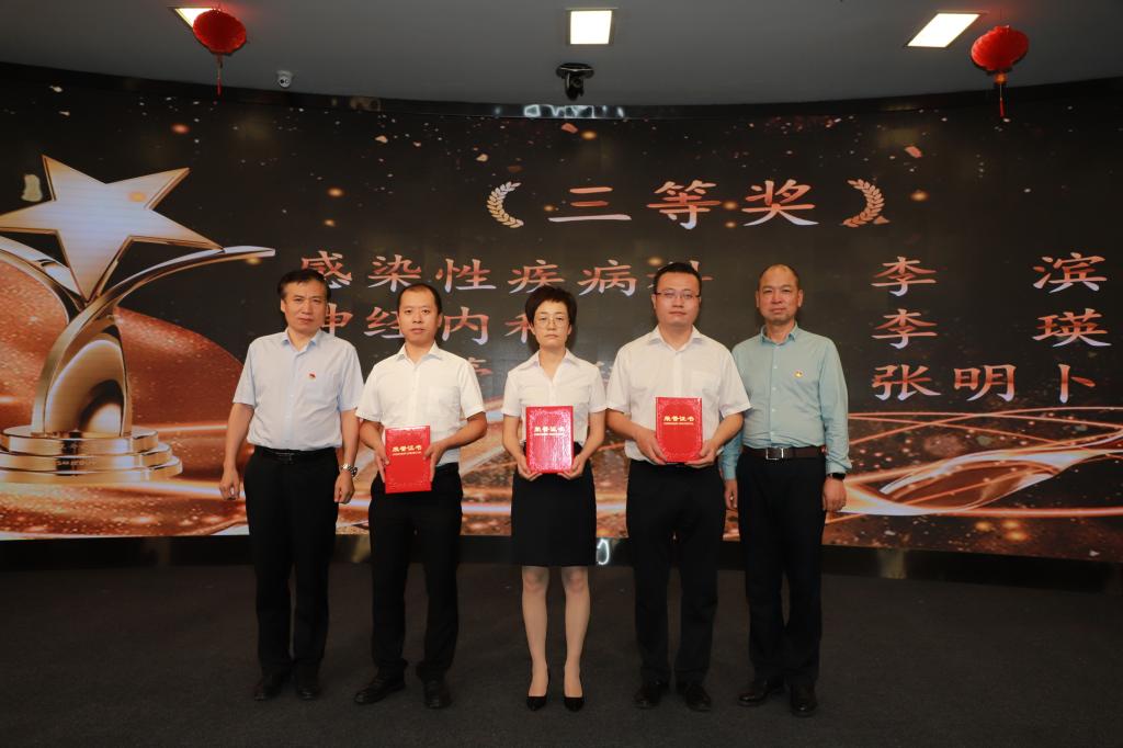 党委副书记党继革宣读我院获得市卫健委表彰的优秀学科带头人、优秀医师、疫情防控卫士、疫情防控突出贡献奖、优秀医务管理工作者、医疗创新先进集体和个人名单。会议对医院第二届青年医师临床病例分析比赛、第二届病案首页质量大赛获奖科室和个人进行了表彰。