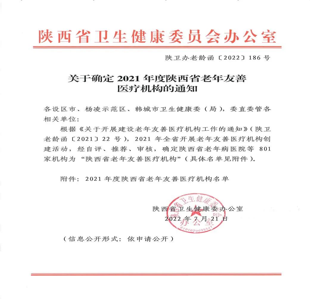 近日,经过自评、推荐、审核,乐鱼手机站入口被陕西省卫生健康委员会评定为“陕西省老年友善医疗机构”,正式授牌。
