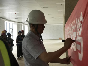 五建项目经理尚文博传达中省市安全生产相关文件,参会人员宣誓并进行签名。五建安全员李燎现场指导工人正确佩戴安全帽、使用安全绳、脚手架、安全用电方法。随后,五建集团公司检查督导工程一部经理马建讲话。